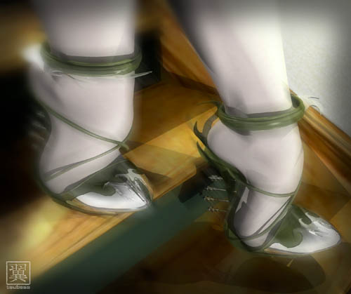 of the sole wrapped around the ankle and fastened to the opposite edge.