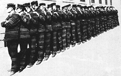 Inmate stripes pre-1904: One stripe for first timers, 2 for second offenders and 3 for even more frequent repeaters. Right -- Inmate solid grays begin 1904.