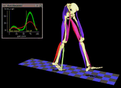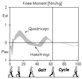 The dorsiflexors (mainly tibialis anterior) can be seen to be active for only a very short time immediately after initial contact, and the amount of moment generated is very small compared to the plantarflexors. The purpose of this small moment is to prevent foot slap, as we will see later.