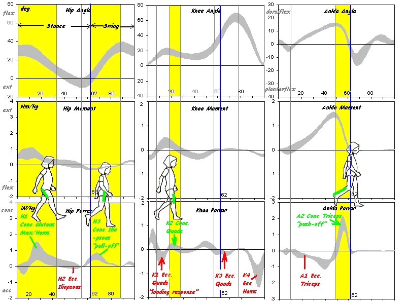 The power bursts of the muscles during normal gait have been given a standard nomenclature by David Winter, according to the joint (H, K or A) and timing (1, 2, 3 etc.) in the cycle.