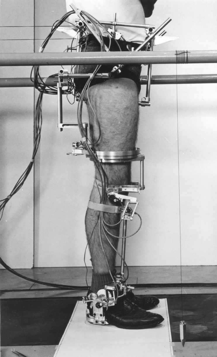 The pelvic frame was attached with eight contacts, over the ASISs, iliac crests, pubis, sacrum, and ischial tuberosities. The hip joint was an Euler sequence - flexion, abduction, axial rotation - that was aligned to the anatomic hip joint. Knee and ankle joints were measured with parallelogram linkages that did not depend on precise alignment with the anatomic axes for accurate angle measurements. Measurements were conducted on a treadmill to allow averaging of multiple cycles. Pelvic motions, both linear and angular, were recorded by parallel strings attached to displacement transducers mounted to the treadmill frame. Potentiometers provided electrical outputs which were recorded onto an FM modulated instrumentation tape recorder. Replay from the recorder was converted to digital format on a DEC PDP-7 computer (18 bit).